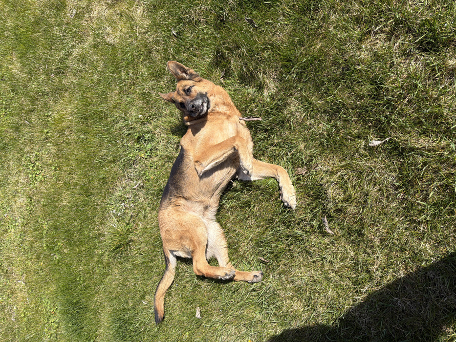 The scene depicts an outdoor grassy area in Rupkite, Bulgaria, under direct sunlight. A single German Shepherd-type dog with a tan and dark brown bi-color coat is lying on its left side on the green lawn. Its body is oriented horizontally across the lower central portion of the frame. The dog's head is turned towards the camera, with its mouth slightly open, appearing relaxed. Its front paws are bent near its chest and head, and its hind legs are splayed. The immediate environment consists of short, green grass with some interspersed weeds. A significant dark shadow, originating from an unseen object, occupies the lower left quadrant of the image. No other individuals or prominent objects are visible within the frame.