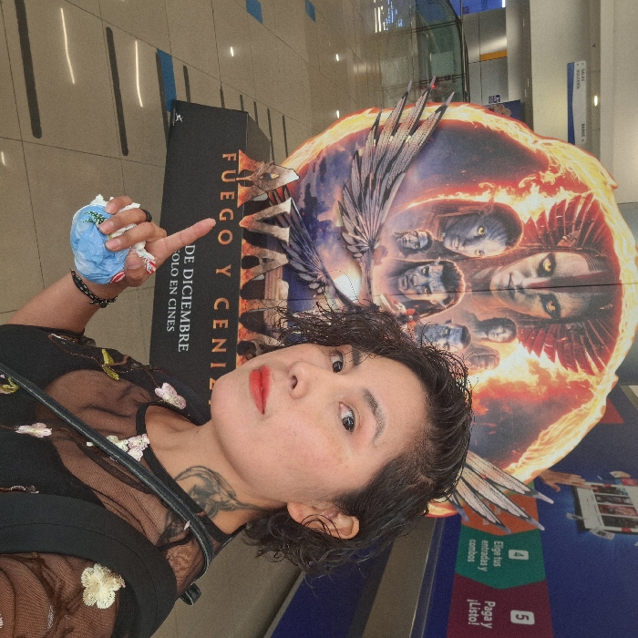A person poses for a selfie in front of a movie poster for "Avatar: The Way of Water." The poster is brightly colored with fiery hues and features faces of characters from the movie. The person holds a small object in their left hand and extends their right index finger upward. In the background are the tiled floor, an advertisement stand, and directions to the theaters.
