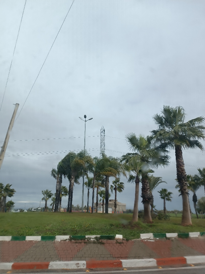 The image depicts an outdoor scene in Majjate, Morocco, under an overcast sky. In the immediate foreground, a concrete curb is visible, painted with alternating red and white horizontal stripes, separating a paved surface from a grassy area. The paved surface features a white solid line and yellow road reflectors. The mid-ground consists of a verdant grassy median or park area populated by numerous palm trees of varying heights, predominantly tall specimens with visible trunks and green fronds. A tall, grey street light pole with a single luminaire is centrally positioned among these trees. To the right of the street light, a lattice-structured telecommunications or utility tower rises above the tree line. In the mid-ground left, several white vehicles are visible on a distant road or parking area, against a backdrop of green. Further back on the right, partially obscured by palm trees, a low-rise building structure is discernible. Overhead, multiple thin power lines traverse the upper portion of the frame, extending from a utility pole partially visible on the far left edge. No individuals are visible. The environment appears to be a cloudy day.