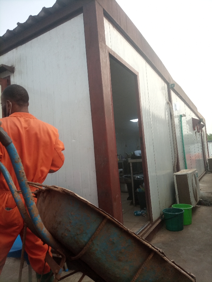 A person in an orange jumpsuit pushes a rusty blue wheelbarrow toward a white modular building. The building has dark brown trim around the entrance and along the roofline. Inside, there's a toilet and stainless steel furnishings. Outside, there's an air conditioning unit and two green buckets. The sky is overcast.