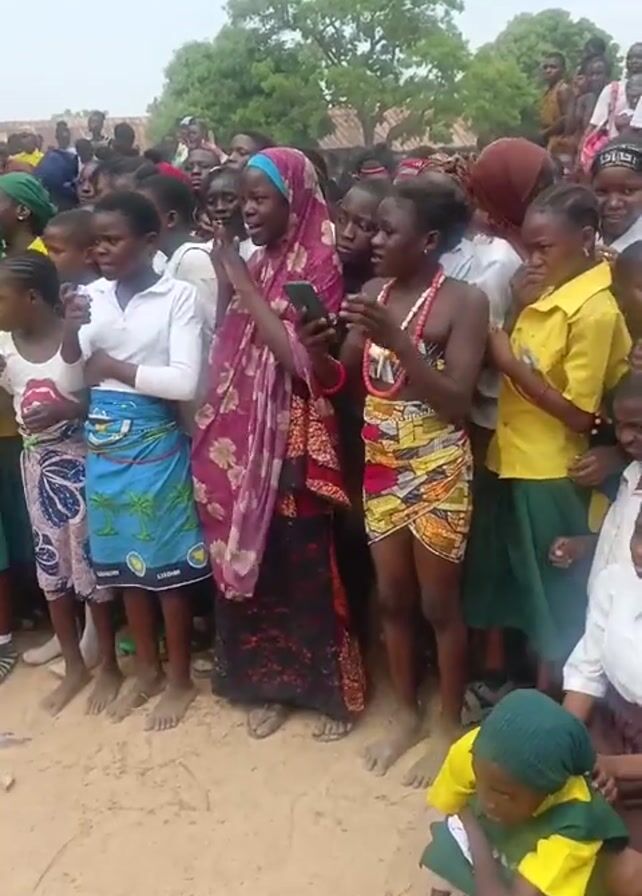 A medium shot shows a large group of people, mostly young girls, on a sandy outdoor area. They appear to be watching or reacting to something happening in front of them, with some pointing or holding their hands to their chests. Several people are wearing school uniforms, including white shirts with colored skirts, yellow shirts, and a green outfit. One woman in the middle of the crowd is wearing a purple floral headscarf and holding up a smartphone, seemingly recording the scene. The backdrop includes a large tree and other figures in the distance, suggesting a public gathering or event.