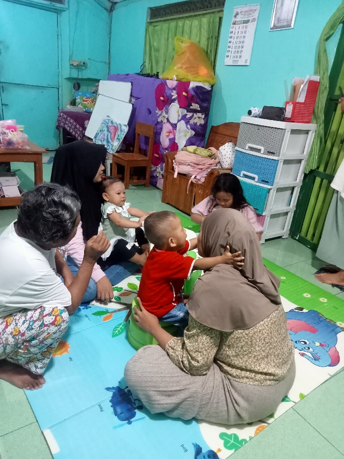 The scene depicts an indoor gathering of six individuals in what appears to be a residential living area within Kecamatan Pati, Indonesia. The room features light blue-green painted walls and a tiled floor, partially covered by blue and green foam play mats with cartoon animal and nature illustrations. Five women and one male child are present. In the foreground, an adult woman with dark, short hair, wearing a white short-sleeved top and patterned pajama-style pants, crouches on the left. Beside her, an adult woman wearing a black hijab, light pink top, and blue jeans sits cross-legged, holding an infant dressed in a white sleeveless top and dark pants. The infant faces away from the camera, towards the right. To the infant's right, a male toddler, wearing a red short-sleeved shirt and blue jeans, sits on a small green potty trainer chair. He is facing away from the camera, reaching towards an adult woman seated on the floor with her back to the camera. This woman wears a light brown hijab, a patterned long-sleeved top, and light-colored long pants, with the toddler's hands resting on her shoulders. Further to the right, a young child with dark hair, dressed in a pink top, sits on the floor, looking downwards. The background shows various household items. On the left, a light wooden table holds clear plastic containers with items inside. Above it, a shelf holds additional items. A small wooden chair is visible near a wooden cabinet or chest covered with a purple floral patterned fabric. An orange plastic bag rests atop this cabinet. To the right, a white plastic multi-drawer storage unit with grey, blue, and pink drawers is visible. A white calendar displaying numbers and a framed picture hang on the wall. Green curtains are drawn across a window in the upper left background. The overall environment suggests a functional, lived-in domestic space.