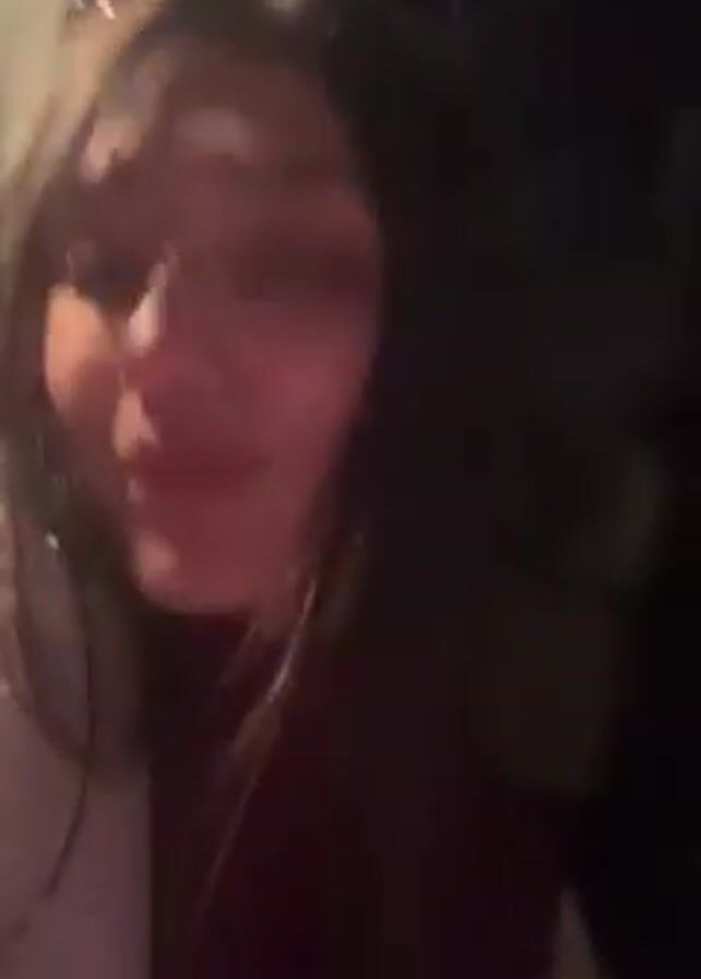 A young woman with long brown hair and sunglasses perched on top of her head is visible in the video. She is wearing a fluffy white jacket over a dark burgundy shirt. She is making faces at the camera, including pouting and smiling. The background is dark and blurry, suggesting it is nighttime. The lighting is uneven, and the environment seems to be outdoors, possibly with a tent or some sort of awning visible in the upper left corner. There are voices and indistinct sounds in the background.