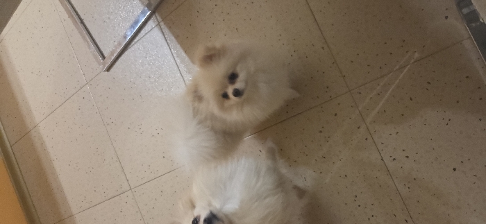 - "The scene depicts two small, light-colored canines, consistent with Pomeranian breeds, within an indoor setting" by FM-o6gJl1, licensed under CC BY 4.0