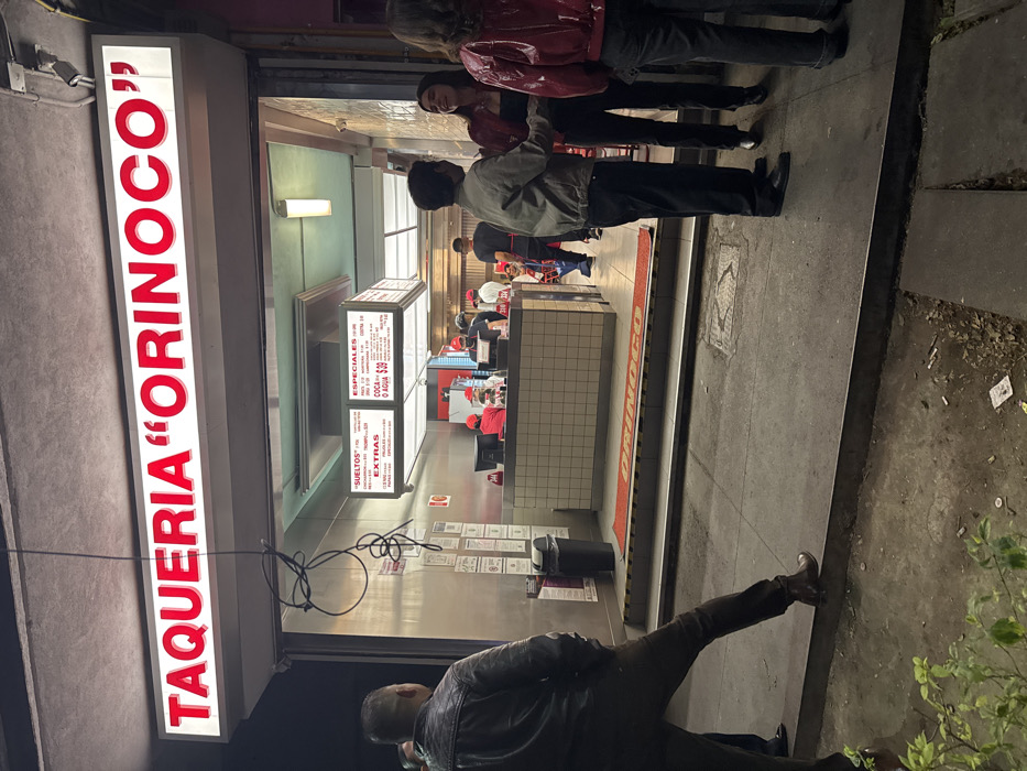 The image depicts a nighttime street scene outside "TAQUERIA 'ORINOCO'" in Mexico City, Mexico