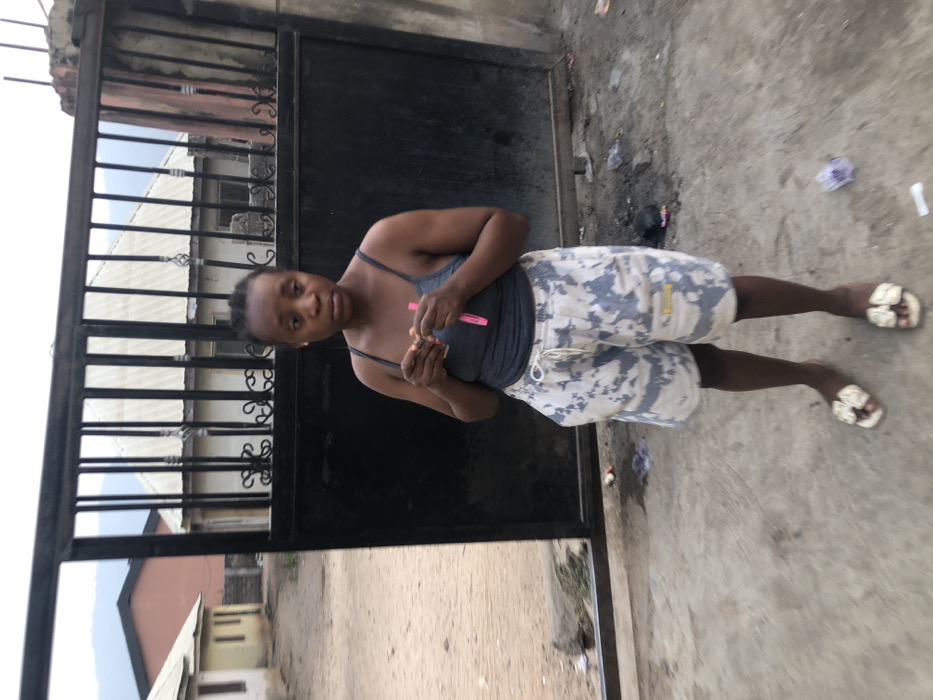 A young woman stands in front of a black metal gate, holding a pink object in her hands. She wears a gray tank top and camo shorts with light-colored sandals. The ground is concrete with debris scattered around. In the background are buildings with visible rooftops. The image is slightly tilted.
