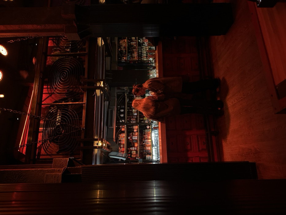 Two individuals stand at a dimly lit bar area. Behind them, shelves are filled with bottles and illuminated by soft light. Industrial-style fans are prominently displayed. A heavy chain is partially visible. The color scheme is largely reddish-brown.