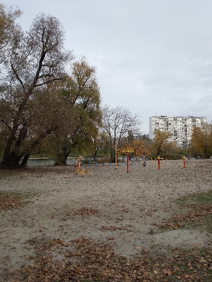 The image displays an outdoor recreational area in Kyiv, Ukraine, specifically a park section adjacent to the Rusanivka Canal, with residential buildings in the background. The scene is set on an overcast day, likely in late autumn or early winter, indicated by the widespread cover of dry brown fallen leaves on the ground and the sparse, autumnal foliage on deciduous trees. The ground in the foreground and midground is composed of sandy or dirt material, heavily strewn with brown leaves. Situated in the midground is an outdoor gym area featuring approximately six distinct pieces of exercise equipment made of yellow and red painted metal. One prominent yellow, low-lying machine, resembling a rocker or balance apparatus, is positioned towards the left-center. Other equipment includes vertical red posts with yellow horizontal bars or handles, consistent with pull-up or upper-body exercise stations. Behind the gym equipment, closer to a line of trees, several light blue metal benches are visible. To the far left, a body of water, consistent with the Rusanivka Canal, is partially visible through the lower branches of large, mature deciduous trees with thinning brown leaves. In the background, a large, multi-story residential apartment block, estimated to be 10-12 stories high, dominates the right side. This building features a light grey facade with numerous balconies, typical of Soviet-era panel construction, and appears behind a further line of trees. Two indistinct human figures are visible in the far right background, near the base of the distant residential building; their specific actions or interactions are not discernible. The overall lighting is diffused and even, consistent with an overcast sky.
