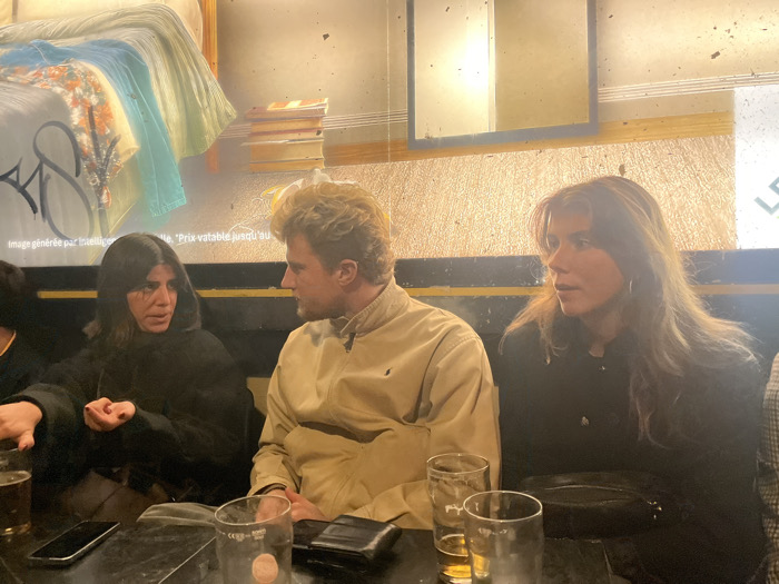 The image displays three individuals seated at a dark-colored table within an indoor establishment, likely a bar or restaurant, in Paris, France