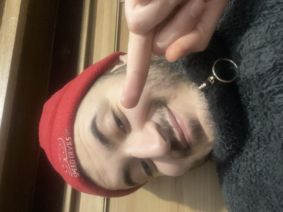 A man lies on a wooden surface wearing a red beanie with white lettering. He has dark hair and a beard, and his eyes are closed. He points down at his nose with his right index finger. He wears a dark, fuzzy zip-up jacket with a gold ring attached to the zipper. The image is taken from a slightly angled perspective.