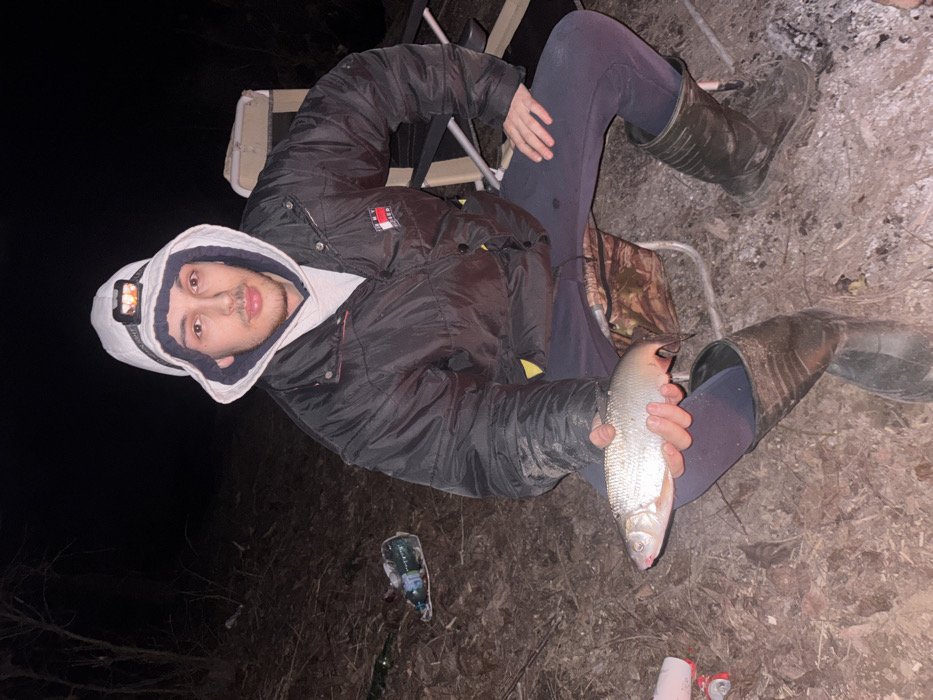 In Suhache, Bulgaria, an outdoor scene unfolds at night. A young adult male, with a light mustache and stubble, is seated on a collapsible camping chair. He wears a white hooded sweatshirt with an activated headlamp positioned on the hood, a black puffer jacket displaying a "TOMMY HILFIGER" logo on the left chest, dark trousers, and dark, mud-splattered rubber boots. He holds a silver-scaled fish, approximately 30-35 cm in length, horizontally in his left hand, presenting it towards the viewer. A small red mark is present near the fish's mouth. The ground is uneven, composed of dirt and scattered dry leaves. Behind the male, to his left, a discarded plastic bottle and a dark green bottle lie on the ground. To his right, the partial frame of the camping chair is visible, along with an area of light-colored ash on the ground, indicating a recent or nearby fire. A red and white aluminum can rests on the ground in the lower-left foreground. The background is dark and indistinct, showing faint silhouettes of bare trees.