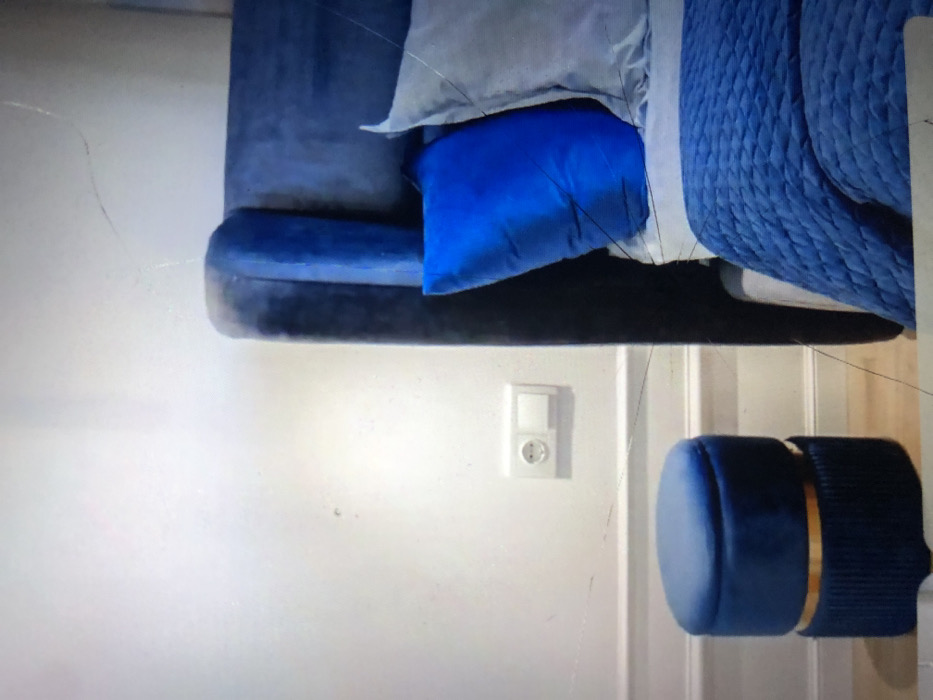 This image depicts a static interior scene within what appears to be a bedroom located in the city of Akpaka Forest Reser, Nigeria. The frame is dominated by a dark blue velvet upholstered bed and a matching stool against a white wall. On the right, a bed features a high, winged headboard made of dark blue velvet. The bed is dressed with a quilted royal blue bedspread or duvet. Two pillows are visible: one vibrant royal blue pillow leans against the headboard, and a lighter grey or silver-toned pillow is positioned behind it. The wall on the left is painted white or off-white and includes a white electrical outlet with a single circular socket (Type F) and an adjacent white rocker light switch, both mounted above a white decorative molding panel. On the left, a cylindrical stool or ottoman is situated on a light-colored wooden floor. This stool is upholstered in dark blue velvet, matching the bed, and features a prominent gold-colored band separating its top cushion from its base. The base has vertical fluting or pleats. The scene is brightly lit, suggesting an indoor setting. No people are present, and no actions or interactions are depicted. The overall aesthetic is modern and cohesive, with a strong emphasis on blue tones. Visible fine lines and scratches are present across the image surface, indicating it may be a photograph of a screen or a damaged photographic print.