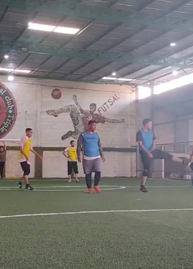 group of men playing futsal on an indoor court. The court has a green artificial turf surface with white lines marking the boundaries. There is a goal with a yellow net on one side of the court. A mural depicting futsal players and the words "Triple Nine Futsal Club" is painted on the wall behind the goal. Several men wearing different colored jerseys are running around the court, passing a ball. Some parked motorcycles are visible near the back of the court. The camera is positioned behind the goal, providing a view of the action on the court.