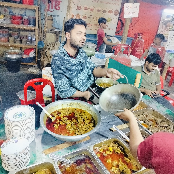 - "A food vendor stands behind a table covered with large bowls and trays of various meat dishes" by FM-rkNqI2, licensed under CC BY 4.0