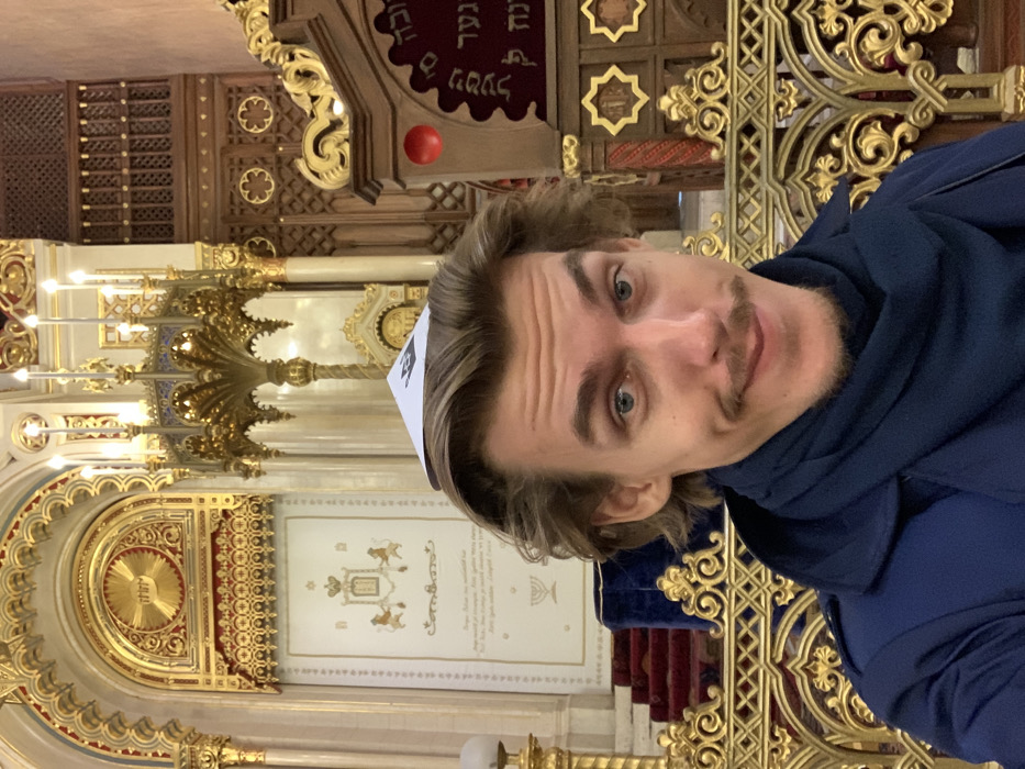 A male subject, appearing to be between 20 and 35 years old, with light eyes, wavy brown hair, a mustache, and a goatee, is depicted in a headshot/selfie taken inside the Dohány Street Synagogue in Budapest, Hungary
