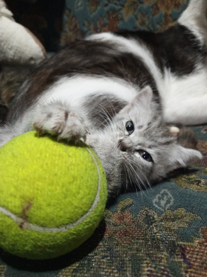 In Viengkham, Laos, a light grey and white tabby kitten is observed lying on its left side on a dark teal/green patterned fabric surface, likely upholstery, which features floral or organic motifs in red, brown, and gold tones. The kitten's right front paw rests atop a bright yellow-green tennis ball positioned in the lower-left foreground. Its head is turned towards the viewer, with its blue-grey eyes open. Partially visible behind the kitten is the torso of an adult cat with dark brown/black and white fur. A white, soft object is also discernible in the upper-left background. No human subjects are present.