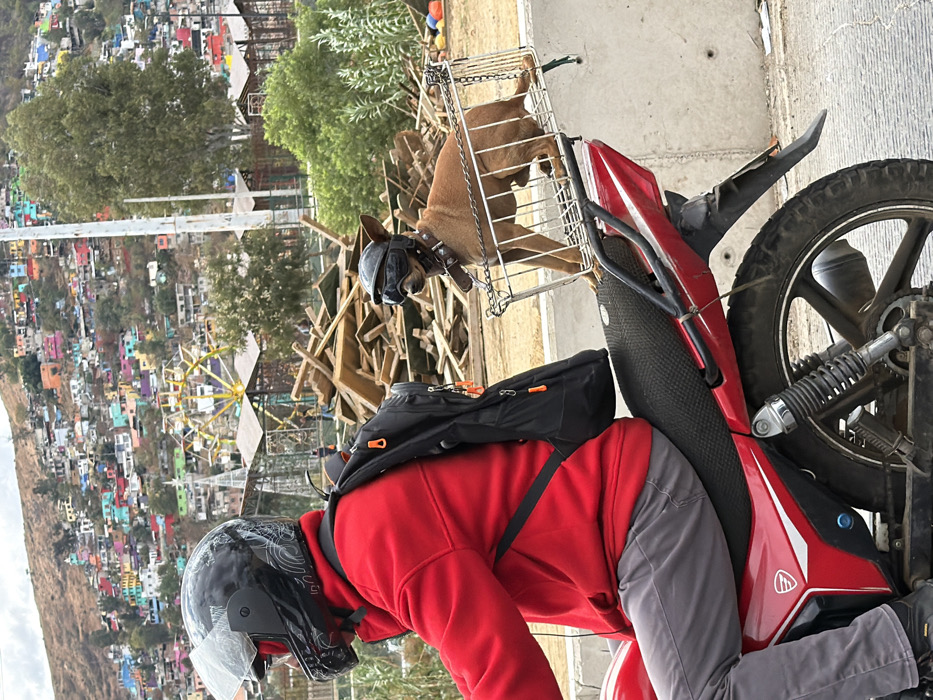 A person in a red hoodie and grey pants is riding a red motorcycle. A black backpack sits behind them on the bike. A brown dog wearing goggles is riding in a wire basket attached to the motorcycle behind the person. The background is a hillside town with colorful buildings, a ferris wheel, and a pile of wooden planks.