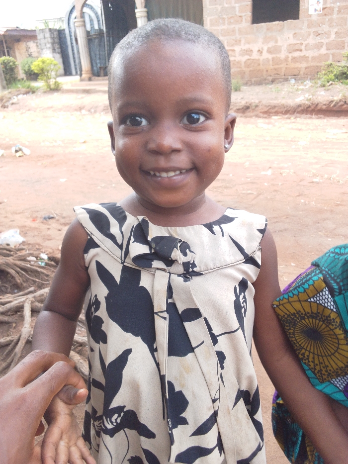 A young child with a shaved head smiles at the camera. The child wears a light-colored dress with a black floral pattern and a ruffled neckline. A hand holds the child's hand on the left, and another person wearing a colorful patterned garment is to the right. The background shows a building with an arched entryway, a brick wall, and some vegetation. The ground is dirt-colored.
