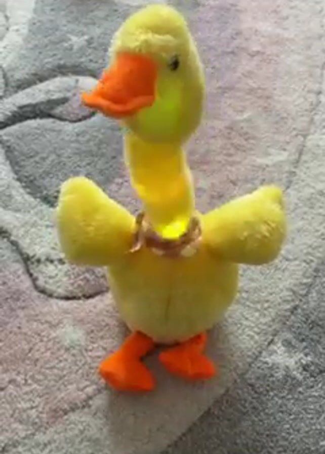 yellow plush duck toy with orange feet and beak. It's standing on a carpet with shades of grey, white, and pink. The duck has a ring around its neck and the neck illuminates. The duck is playing a song.