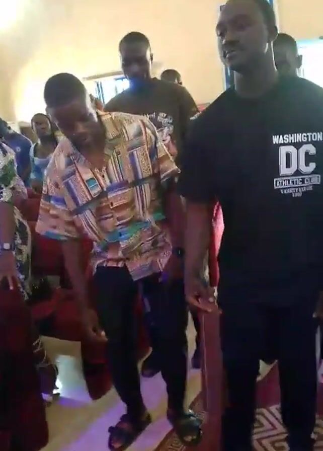Several people are dancing in a room with pews. One man wears a patterned shirt and sandals. Another wears a black t-shirt with a "DC" logo on it. They appear to be in a church or similar gathering space. The floor is tiled and there is a rug. There are other people in the background, some sitting on the pews. The room is brightly lit. The men seem to be enjoying themselves.