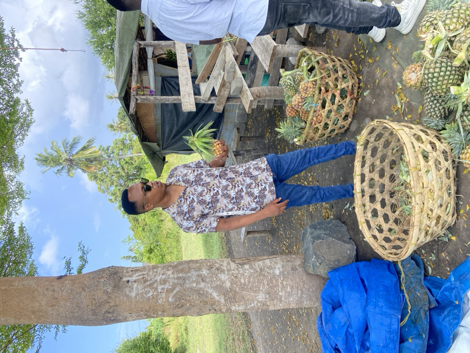- "man in a brown and white patterned shirt and blue jeans standing in front of a wooden stall, holding a pineapple" by FM-hlmC83, licensed under CC BY 4.0