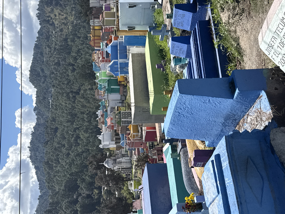 This vibrant, colorful cemetery, likely in Guatemala or Mexico, stretches up a hillside near a dense forest