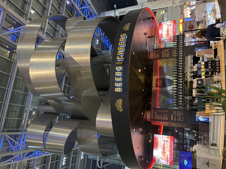 A modern airport bar features "Beers & Cheers" prominently displayed