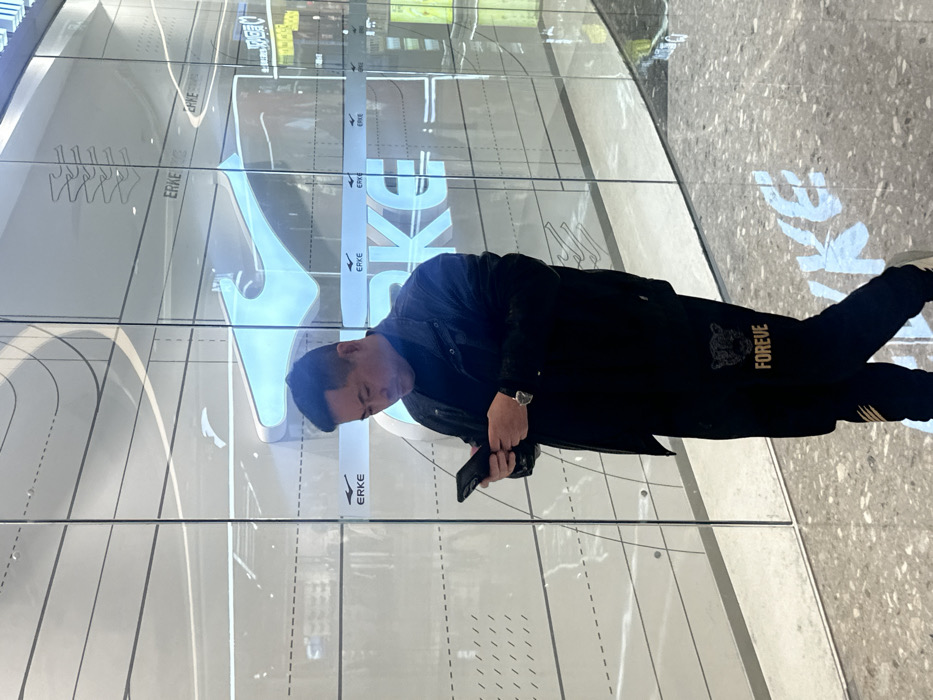 An East Asian male, appearing middle-aged, is depicted standing indoors in Jiangjin, China, in front of a retail store. He wears a black long-sleeved top, a black jacket, and black track pants featuring a gold-colored stylized tiger head design and the partial text "FOREVE" on the left thigh. A silver-toned watch is visible on his left wrist. He holds a dark-colored smartphone with both hands, looking down intently at its screen. The background consists of a prominent glass storefront with multiple "ERKE" logos and text applied to the glass. Behind the glass, a large, illuminated blue-toned ERKE emblem is visible. The polished, light-colored floor reflects elements of the store's signage and overhead lighting, indicating a commercial environment, likely a shopping mall.