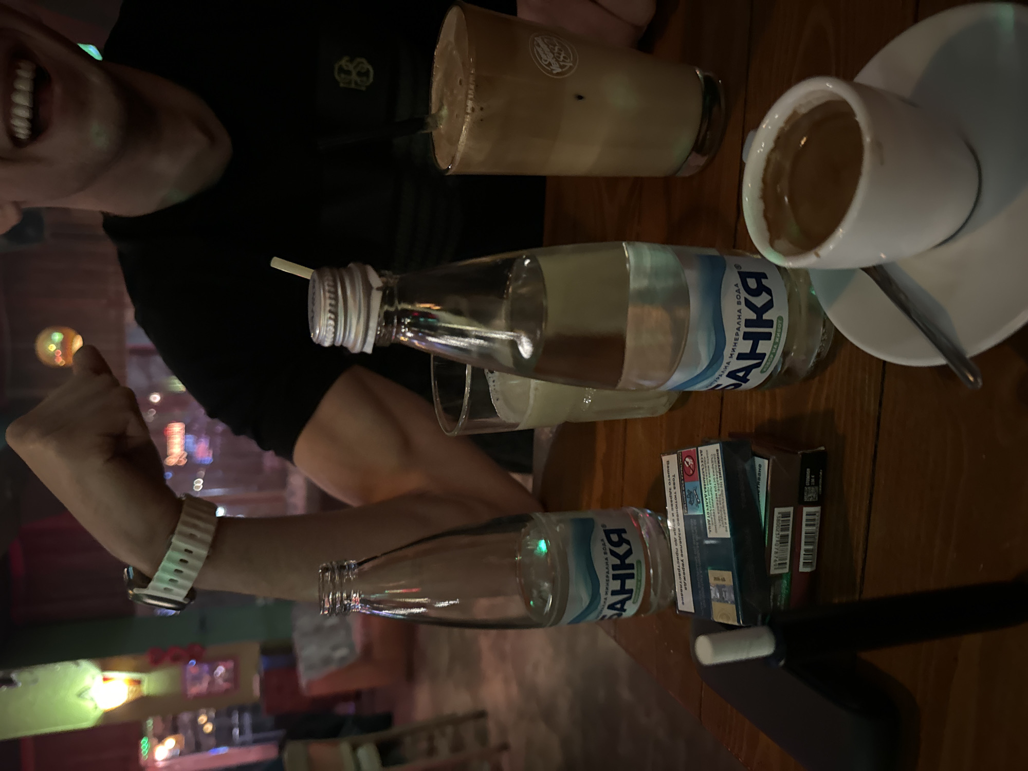 The image captures a scene from what appears to be a cafe or restaurant, given the presence of beverages and tabletop items. A person is partially visible on the left side of the frame, showing a smiling face and part of their torso clad in a black shirt. On the person's wrist is a white smartwatch. On the table are multiple drinks: a glass of what looks like iced coffee, a bottle of "Bankia" mineral water, a glass with liquid inside, and a white cup of coffee or espresso on a saucer with a spoon. Two packs of cigarettes and a smoking device are also on the table. The lighting suggests an indoor environment with soft and somewhat dim illumination. In the background, blurred lights and colors give the impression of an urban setting, possibly street lights or building signs. Based on the Cyrillic text on the bottle, which translates to "Bankia Mineral Water," and the presence of Bulgarian text on the cigarette packs, the location is likely Bulgaria. The text visible on the cigarette packs is Bulgarian and warns about the dangers of smoking. Given the cafe-like setting, the image conveys a sense of a social gathering or a personal moment of relaxation.