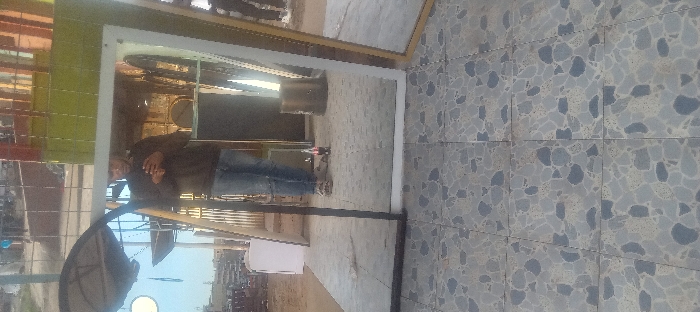 A man stands in front of a mirror on a tiled floor. The mirror frame is light-colored, and the reflection shows the man wearing a jacket and jeans. Behind the man in the reflection, there is a stainless steel object and a glimpse of an outdoor area. The tiled floor is patterned with small, irregular shapes in various shades of gray and blue.