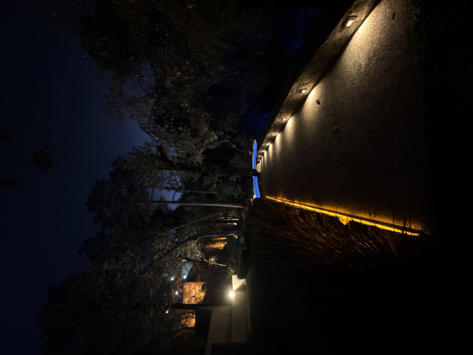 The image captures an illuminated outdoor scene at night in Tetela Del Monte, Mexico. A light-colored pathway, likely gravel or textured concrete, extends from the foreground into the mid-ground, curving slightly right. The left edge of the pathway is bordered by a low bed of ornamental grass, which is highlighted by a continuous orange LED strip light running along its base. On the right side of the pathway, a series of evenly spaced square wall sconces are embedded into a stone retaining wall, casting warm white light onto the path. In the mid-ground, to the left of the pathway, a bright blue, illuminated swimming pool is visible. The background is dominated by dense, dark foliage and numerous tall trees, with a deep blue night sky visible above them. In the far left background, higher up, terraced structures with warm orange ambient lighting are discernable amidst the trees. No individuals or animals are present.