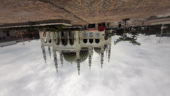large mosque with multiple minarets and a green, patterned dome, reflected in a cloudy sky. Buildings and vehicles can be seen behind the mosque, along with trees and parking areas. The entire scene is rotated 180 degrees, placing the sky at the bottom and the ground at the top of the frame.