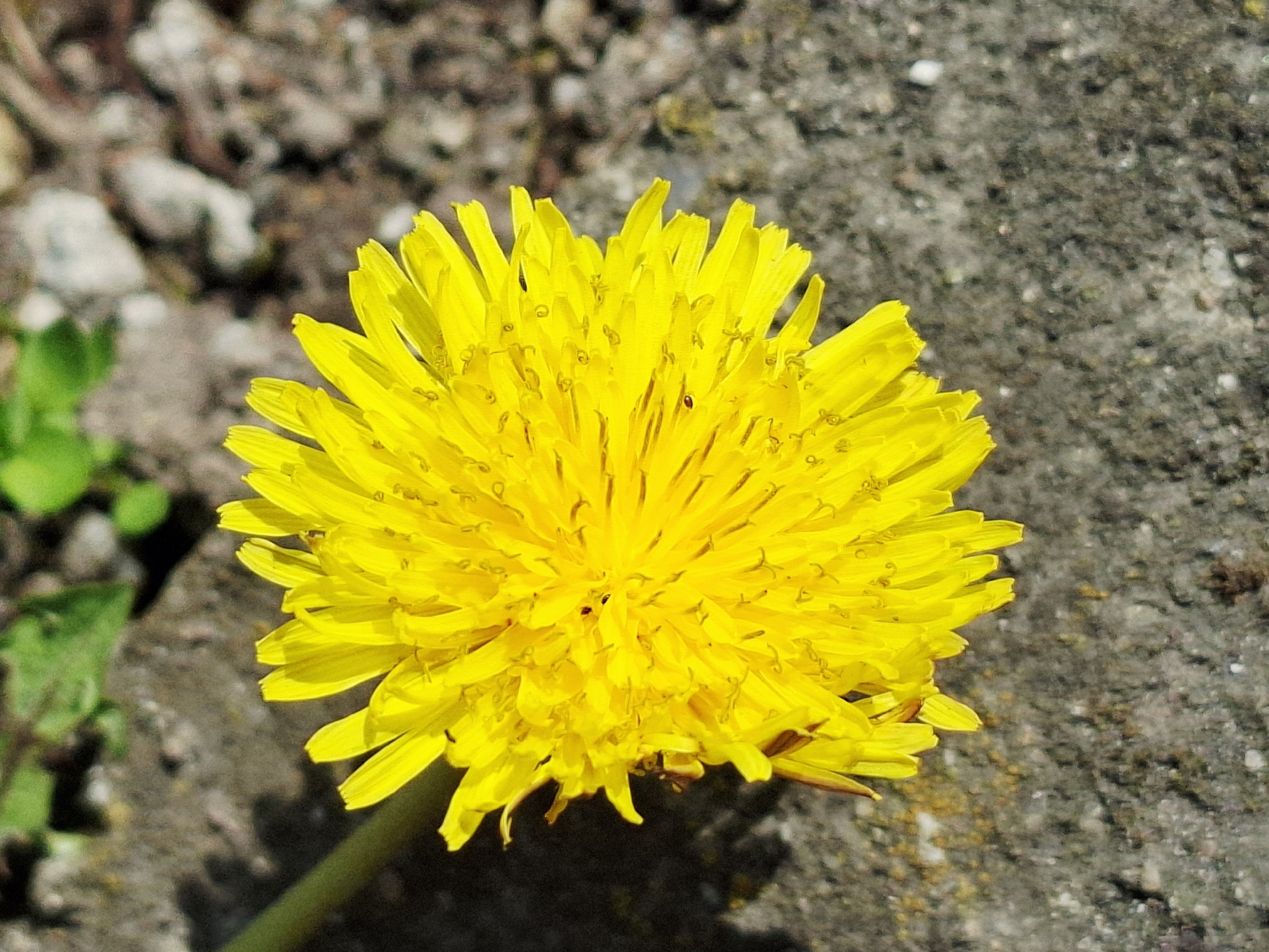 A yellow dandelion flower is in full bloom, positioned off-center to the right against a background of gray, mottled concrete