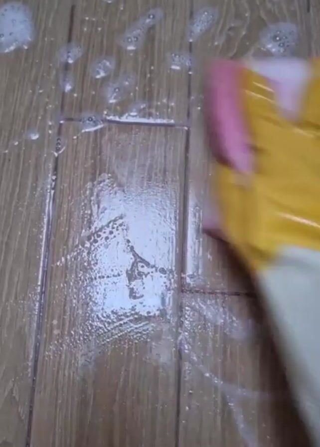 - "A hand wearing a yellow rubber glove and holding a pink and white sponge is seen scrubbing a wooden-patterned tiled floor covered with soapy water" by FM-eDsUh1, licensed under CC BY 4.0