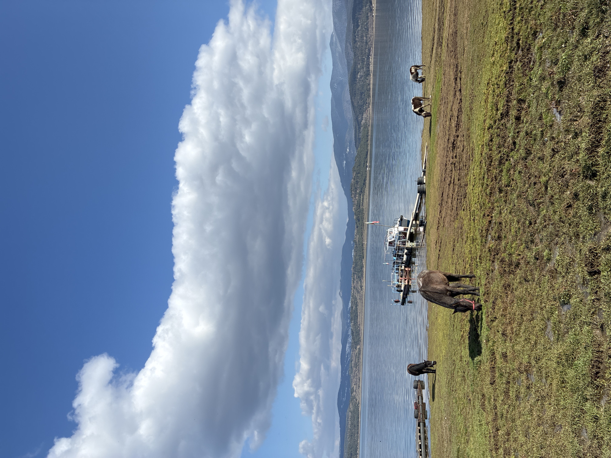 This detailed image depicts a tranquil lakeside scene in Цигов чарк, Bulgaria. The foreground features a muddy, sparse green and brown grassy area where four horses are actively grazing. A dark brown horse with a red halter is prominent in the lower-center, head down. To its left and further back, another dark brown horse also grazes. On the right, two piebald horses, one brown-and-white and one greyish-brown-and-white, are observed near the water's edge, similarly grazing. The midground is dominated by a calm body of water, likely a lake or reservoir, exhibiting slight ripples and reflections. A short wooden pier with stacked tires as fenders extends into the water from the left. Further to the right, a series of white-hulled recreational or tour boats are moored to a floating dock system. One boat displays a red, white, and green horizontal striped flag on its stern flagpole, consistent with the flag of Bulgaria. The background reveals a range of distant mountains, densely covered with trees, with visible patches of snow on higher elevations. The sky above is a bright blue, partially covered by large, fluffy white cumulus clouds, along with some darker grey cloud formations, suggesting a mix of clear and overcast conditions. Sunlight illuminates the scene, casting distinct shadows from the grazing horses. No human subjects are visible.