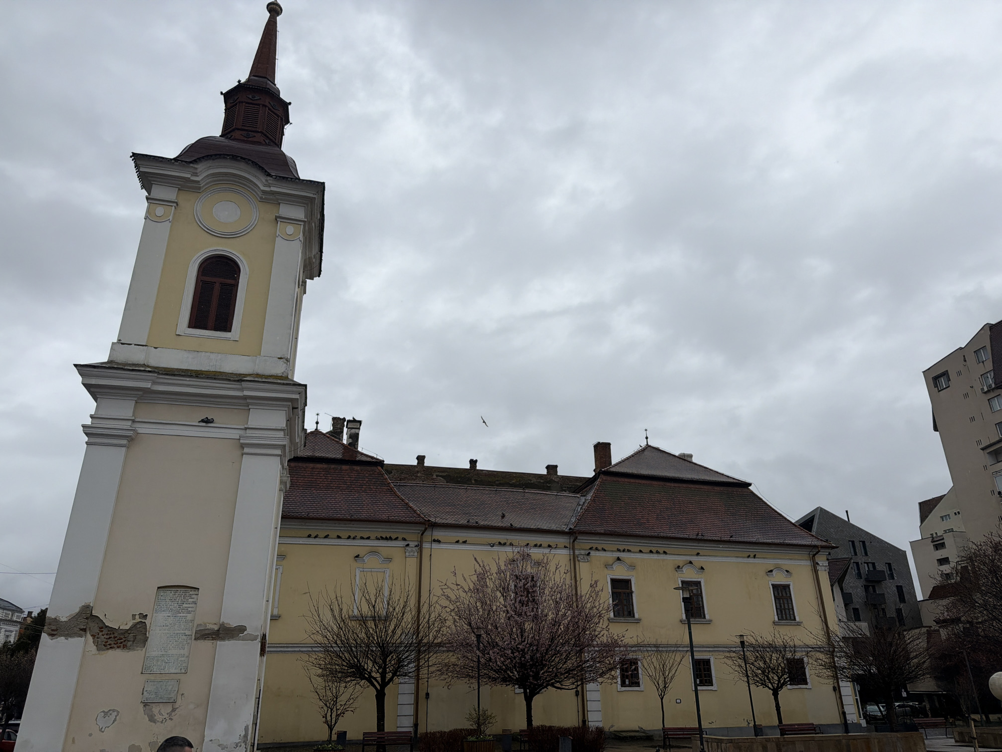 The image depicts a street scene in Târgu Mureș, Romania, featuring a tall, cream-colored tower with a brown spire. The tower stands to the left of a large, yellow building with a red-tiled roof. Many birds are perched on the roof of the building. Bare trees with some blossoms are in front of the building. The sky is overcast. Modern buildings are visible in the background, situated to the right of the yellow building. A small bird is flying in the sky. The base of the tower is damaged. A plaque is located on the damaged section of the tower.