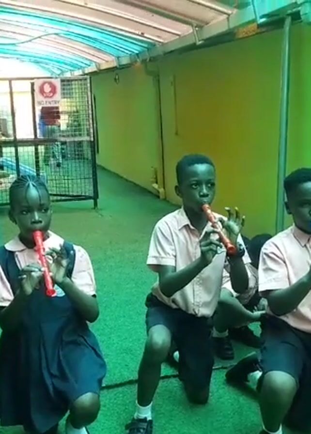 Six children, two girls and four boys, are kneeling in a hallway and playing recorders. The girls are on the left, wearing dark blue jumper dresses with white shirts underneath. The boys are on the right, wearing tan shirts with dark shorts. They are all facing the camera. Each child is holding a recorder and playing it, with various colors of recorders present, including white, red, and blue. The hallway has a translucent roof allowing light to filter in. The walls are painted in bright colors, with green and yellow being prominent. There is a gate visible at the end of the hallway, with a "no entry" sign visible on it. The floor appears to be made of artificial grass.