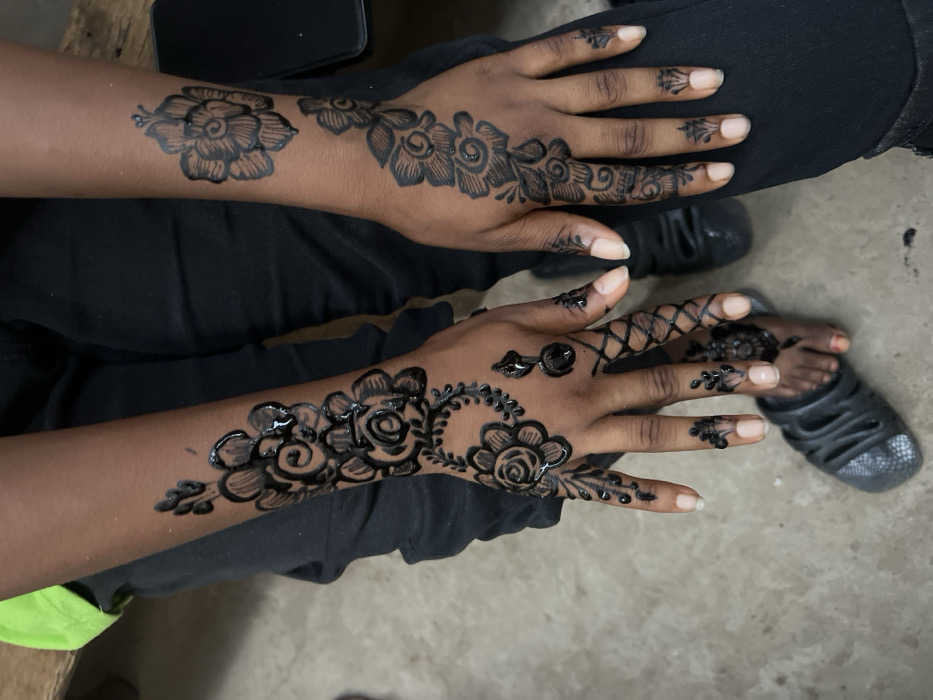 - "The image displays a close-up, overhead view of a person's hands and forearms adorned with intricate black henna (mehndi) designs" by FM-CZcTt1, licensed under CC BY 4.0