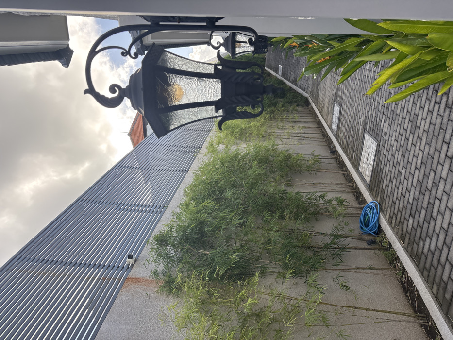 The scene depicts an outdoor paved pathway in Kerobokan, Indonesia. The pathway, constructed of grey interlocking pavers, extends longitudinally into the background, bordered on the left by a smooth grey concrete wall. A dense row of green bamboo plants grows along the base of this wall, with a coiled blue garden hose resting on the ground in the foreground beside them. Above the concrete wall, a dark grey slatted metal fence is visible. A white security camera is mounted on the concrete wall below the fence, which exhibits reddish-brown staining in that area. On the right, two black, ornate wall-mounted lanterns with textured glass, both illuminated with warm light, are affixed to a white architectural element bordering the path. Green tropical foliage, some with visible orange blossoms, lines the right edge of the pathway. In the distant background, a red-tiled roof is partially visible above the slatted fence, beneath a partly cloudy sky.