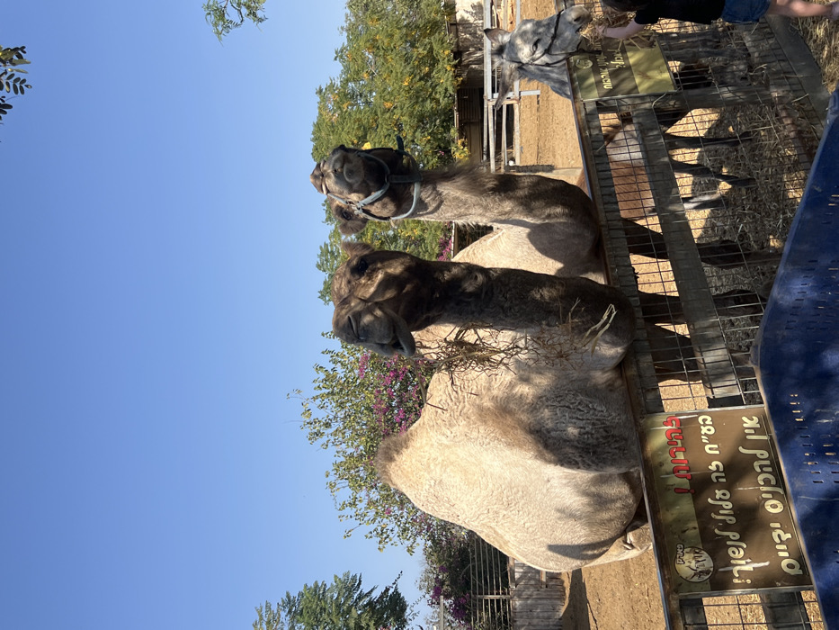 This image depicts an outdoor animal enclosure located in Elishama, Israel, under a clear blue sky