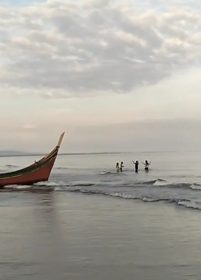tranquil beach scene with a colorful boat resting on the shore. In the shallow water, four people are wading. The sky is overcast with a mix of gray and white clouds. Gentle waves are breaking on the beach. The boat is the only static object, while the people and waves add movement to the scene.