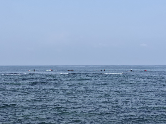 Across a blue, slightly choppy ocean, several kayaks are visible