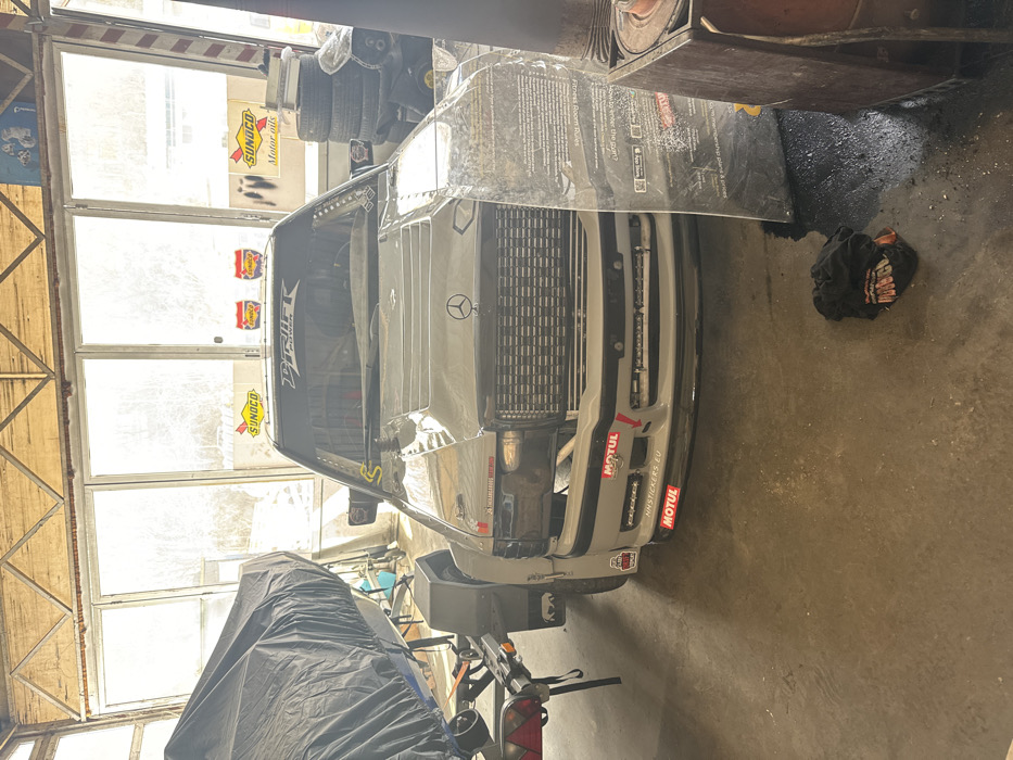 The image depicts the interior of an automotive workshop in Varna, Bulgaria, illuminated by natural light entering through a large bank of rear windows. Centrally positioned is a light gray, heavily modified Mercedes-Benz sedan, likely a W201 or W124 platform, customized for racing or drift. The vehicle features a widebody kit with prominent fender flares, a vented hood, an aftermarket grille with a central Mercedes-Benz star, blacked-out headlights, and a front bumper adorned with multiple "MOTUL" stickers and one displaying "NMSTICKERS.EU". A "DRIFT POWER" banner is affixed to the top of the windshield. To the left of the car, a boat covered with a dark tarp rests on a single-axle trailer. To the right, a stack of black tires is visible, along with an old, dark metal industrial stove or heater in the immediate foreground. A large, clear sheet of material, possibly plexiglass, with printed text including "Fitness Room Rules" and app store logos, leans against the car's front right fender. On the stained concrete floor in front of the heater, a crumpled dark rag lies next to a small, dark liquid spill. The rear windows display "SUNOCO" and "SUNOCO Motor oils" decals. Wooden roof trusses are visible above the windows, completing the utilitarian workshop environment.