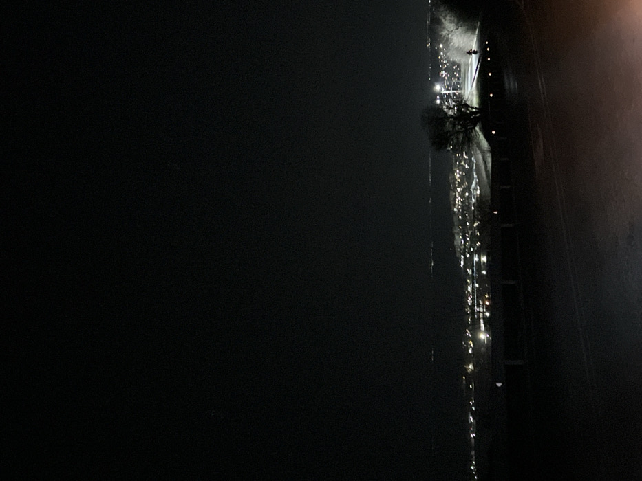 The image depicts a nighttime panoramic view of the city of Lom, Bulgaria, observed from an elevated perspective overlooking the urban area and the Danube River. The upper two-thirds of the frame consist of a dark, clear night sky with no prominent celestial bodies visible. In the lower portion of the image, a dark asphalt road surface curves from the foreground towards the midground, illuminated faintly by distant light sources and a bright streetlight positioned on the right side of the frame. Along the outer edge of this road, a light-colored guardrail or low barrier is visible, marked by several evenly spaced, circular, amber-colored reflective or illuminated elements. To the right of the road, a bare deciduous tree is silhouetted against the city lights, its branches devoid of foliage. Adjacent to this tree, a single streetlight on a pole casts a bright, localized illumination cone onto the road. Within this illuminated section, a solitary individual on a bicycle is traveling away from the viewer, appearing as a dark silhouette with minor reflective highlights on the bicycle frame. The cityscape of Lom occupies the middle ground, extending horizontally across the frame. It is characterized by a dense concentration of artificial lights from buildings, streets, and other urban infrastructure, creating a glowing urban sprawl. Beyond the city lights, a dark, horizontal expanse is visible, representing the Danube River. Faint, sparse linear patterns of light are discernible on the distant horizon beyond the river, indicating settlements or infrastructure on the opposite bank.