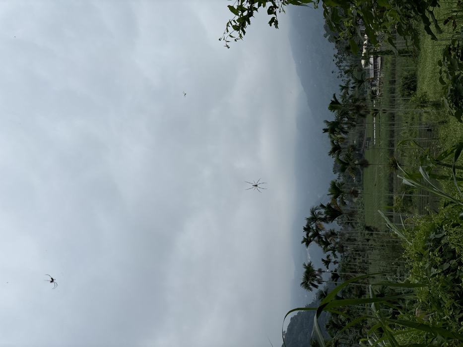 The image captures a rural, mountainous landscape under a heavily overcast sky in Meishan Township, Taiwan. Two spiders are suspended against the grey sky in the upper frame. A larger, dark-bodied spider with long, slender legs is visible in the mid-upper section, slightly left of center. A smaller, darker spider is positioned in the upper-left quadrant. The immediate foreground features dense, dark green foliage and tall grasses. The midground presents a cultivated valley floor with extensive agricultural fields dominated by numerous tall, slender palm trees, likely betel nut palms, arranged in rows, alongside other green crops. Several indistinct residential or agricultural structures are partially visible among the trees on the right side of the midground. The background consists of multiple layers of hazy, blue-grey mountains rising into the mist, extending across the horizon.