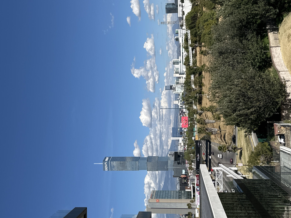 A daytime view of a cityscape under a blue sky with scattered clouds. A tall BBVA building dominates the skyline, juxtaposed against trees and other buildings. A road with car traffic runs alongside. The photograph is taken from an elevated position, possibly a building or high vantage point, overlooking the urban scenery.