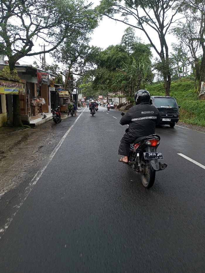 An outdoor, eye-level rear-view image depicts a wet asphalt road scene in Serpang Shalli, Bhutan, under an overcast sky