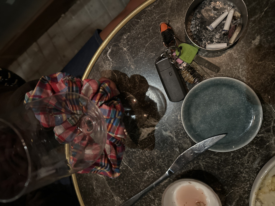 - "An overhead, low-light photograph depicts a collection of items on a dark, marble-patterned table with a golden metallic rim, likely within an indoor establishment" by FM-jXUQf2, licensed under CC BY 4.0