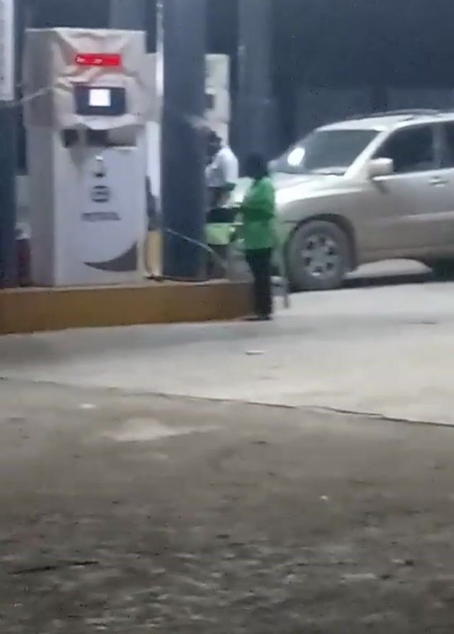 gas station at night. A light-colored SUV is parked at a pump. A person wearing a green shirt is standing near the car, and another person in a white tank top is leaning against a pillar. The ground is visible, with some darker, possibly wet, areas. The gas pump displays a price and brand. The scene appears somewhat blurry and distant.