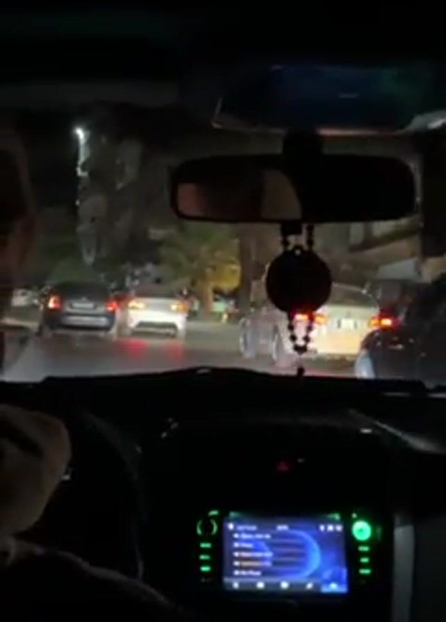 A person is driving a car through city streets at night. The car's dashboard is visible, and a rearview mirror shows the driver. Cars are ahead in traffic, and streetlights illuminate the surroundings. Music is playing in the car.